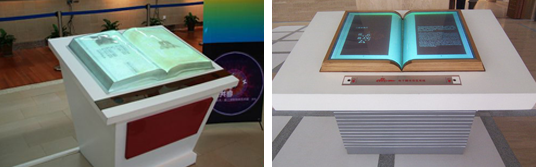 電子翻書(shū),也叫虛擬翻書(shū),空中翻書(shū)、隔空翻書(shū)、魔幻翻書(shū),互動(dòng)翻書(shū),自動(dòng)翻書(shū),立體翻書(shū),是利用動(dòng)作感應(yīng)技術(shù)以及計(jì)算機(jī)多媒體技術(shù)實(shí)現(xiàn)的一種虛擬翻書(shū)的視覺(jué)效果,參觀者只需要站在電子書(shū)前方,在空中做出左右揮動(dòng)手臂的動(dòng)作,面前的電子書(shū)就會(huì)隨著手臂的揮動(dòng)進(jìn)行前后的翻頁(yè),神奇的動(dòng)態(tài)翻頁(yè)效果讓觀眾在驚嘆的同時(shí),也會(huì)對(duì)電子書(shū)展示的的內(nèi)容產(chǎn)生濃厚的興趣。類似的展項(xiàng)還有百米長(zhǎng)卷,隨著參觀者的手臂動(dòng)作,畫(huà)面會(huì)左右移動(dòng),而不是以翻頁(yè)的形式出現(xiàn)。