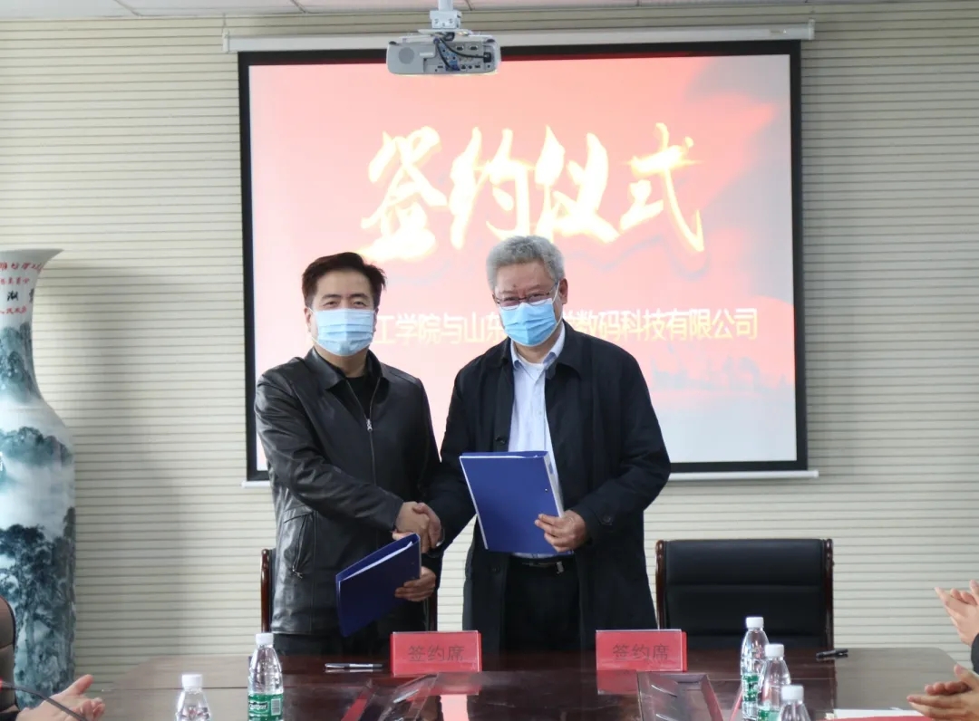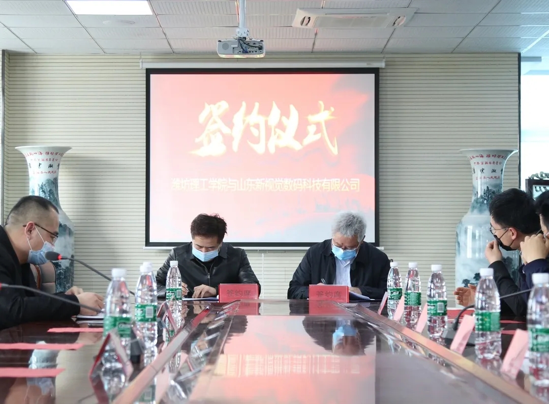 王鐵兵、劉慶林分別代表山東新視覺數(shù)碼科技有限公司、濰坊理工學(xué)院簽署校企共建協(xié)議書并合影留念。