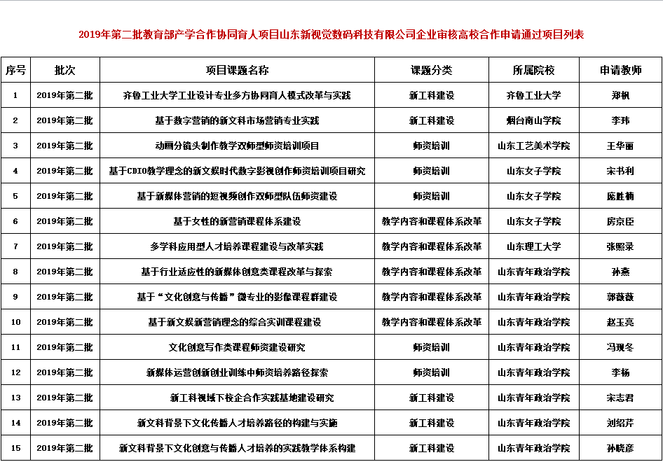 2019年第二批教育部產(chǎn)學(xué)合作協(xié)同育人項(xiàng)目山東新視覺(jué)數(shù)碼科技有限公司企業(yè)審核高校合作申請(qǐng)通過(guò)項(xiàng)目列表